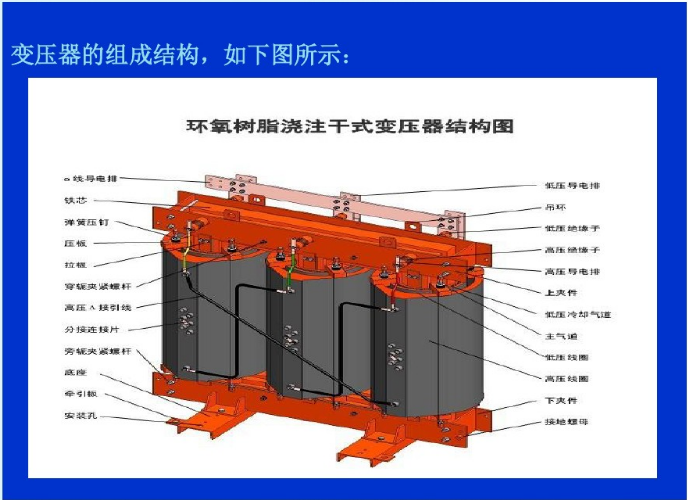 ⒊澆注式:用環(huán)氧樹脂或其它樹脂澆注作為主絕緣,它結構簡單、體積小,適用于較小容量的變壓器。